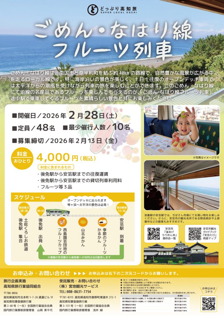 ごめん・なはり線のオープンデッキ車両で、沿線の旬なフルーツを楽しむことができる日帰りツアー「ごめん・なはり線フルーツ列車」の参加者を募集中です。